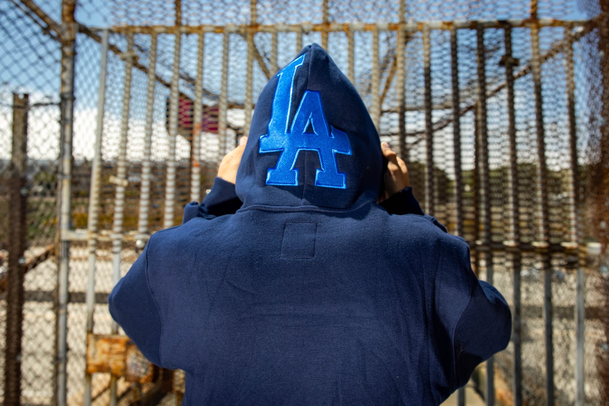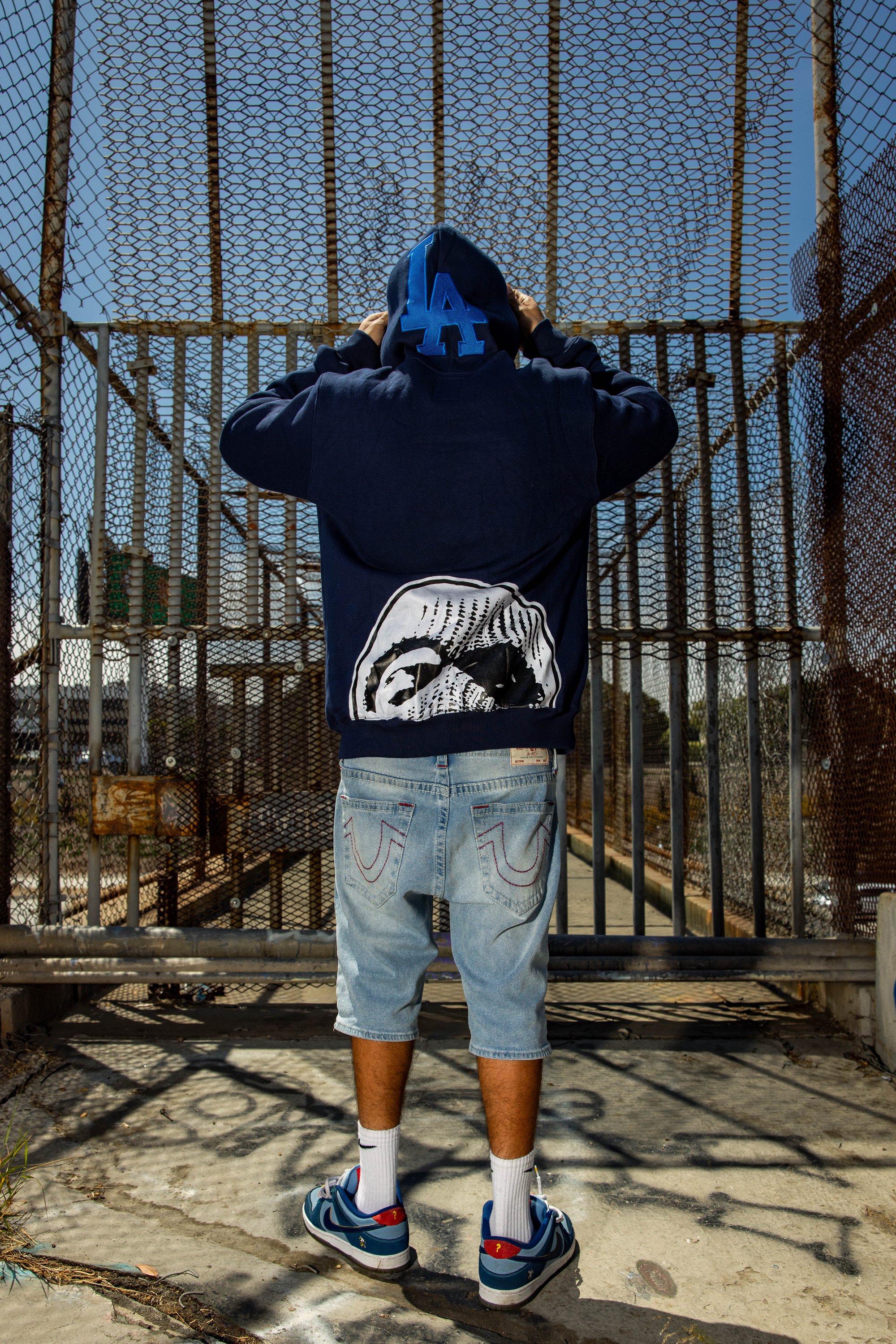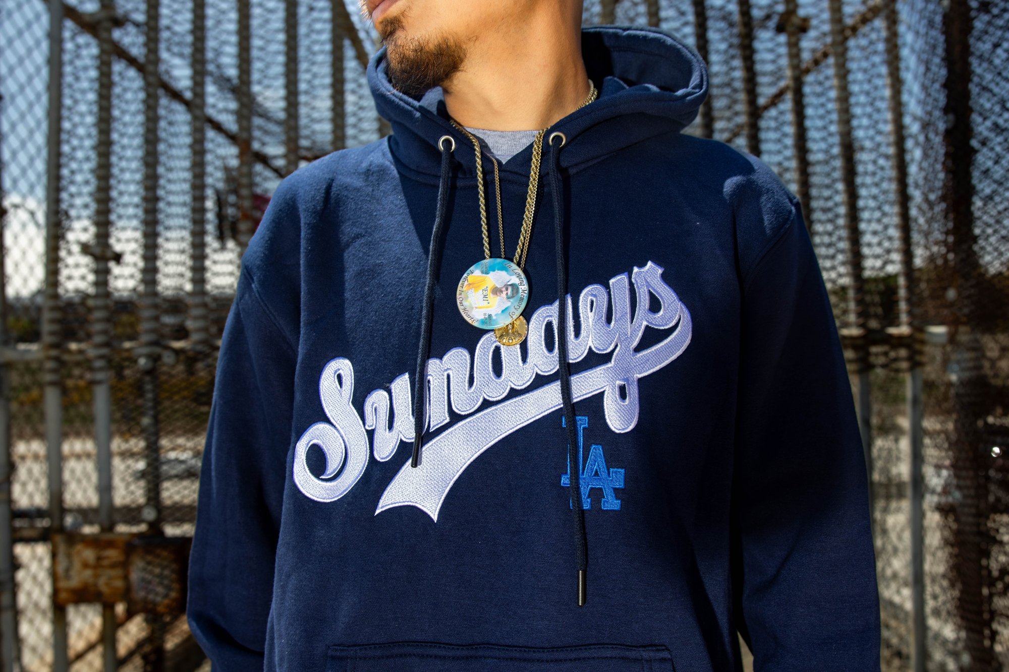 Back again, this time in Navy blue. Our trademark style, super thick, heavy gsm hoodie. Large embroidered logo across front chest and huge embroidered LA logo on hood. Screen print mask logo on back.